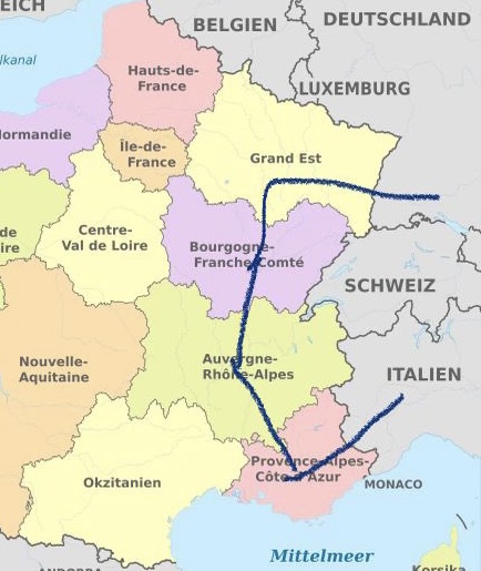 Wir werden uns also in die französischen Alpen aufmachen. Genauer gesagt in die Bourgogne, Auvergne, Rhóne-Alpes und Provence-Alpes. Anschließend geht’s durch die Seealpen rüber in das Piemont und die Lombardei. Am Lago Maggiore vorbei geht es dann über den Alpenhauptkamm zurück nach Hause.