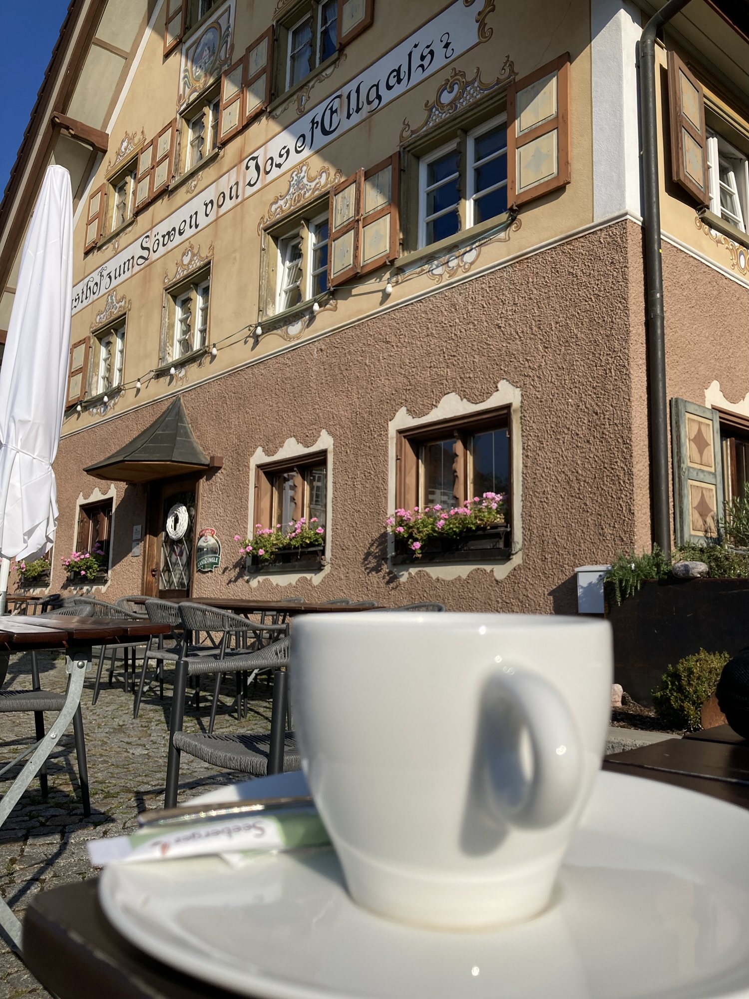 Die ersten Kilometer führten uns ins nahe württembergische Allgäu, dort wo alles schon ein bisschen nach Bayern riecht. Insbesondere der Kaffeeduft einer nahen Hotelterrasse in Eglofs hatte es uns angetan…