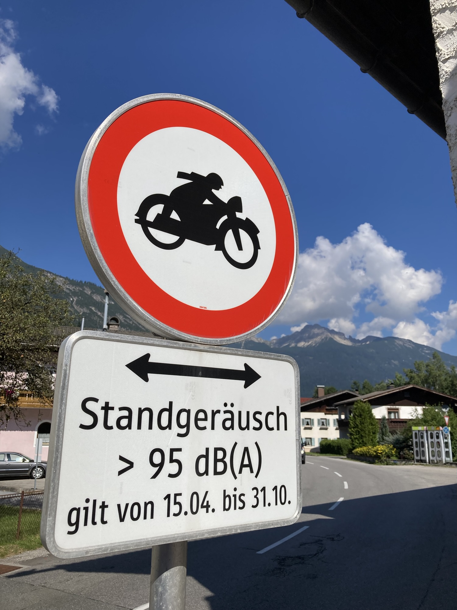 Schnell führte uns die Straße weiter über das Oberjoch und das Tannheimer Tal hinunter ins schöne Lechtal. Nicht wenige Motorradfahrer sind verwundert, wenn sie plötzlich wie hier in Stanzach vor den Lautstärkebeschränkungen stehen, die seit ein paar Jahren die Flut an Lärmwütigen, die es leider auch unter den Motorradfahrern gibt, einzudämmen zu versuchen.