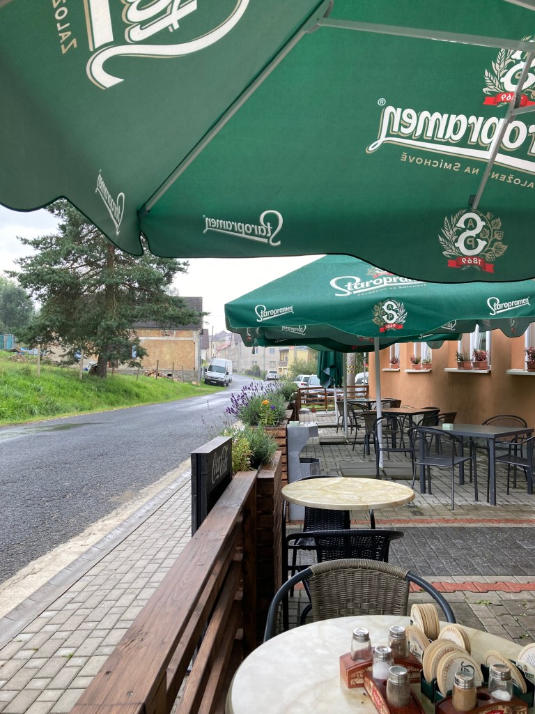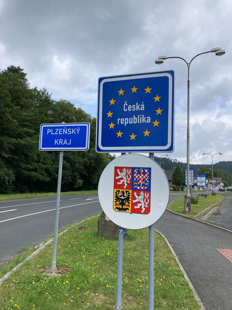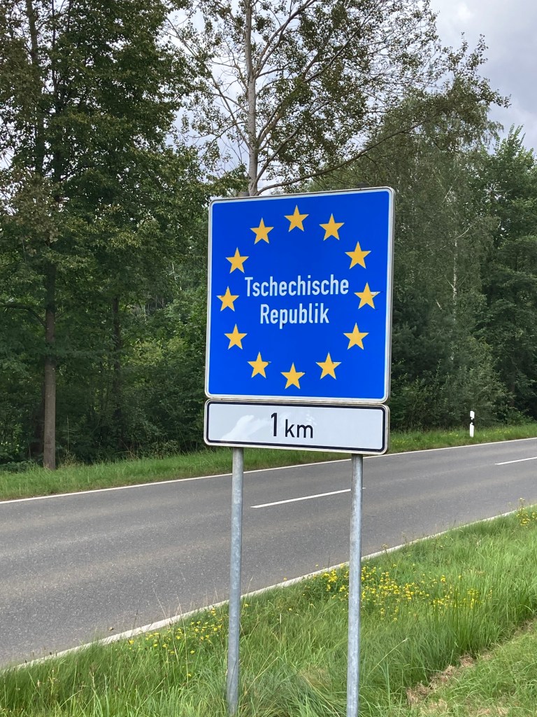 Und so erreichte ich nun am frühen Nachmittag die tschechische Grenze, die mich dann auch gleich mit einer Regendusche empfing. Kein Problem, rechtzeitig noch ne Unterstellmöglichkeit mit einem kurzen Mittagessen verbunden. Dabei habe ich doch tatsächlich einen Regensburger getroffen, der am Bodensee aufgewachsen nun schon seit 40 Jahren in Bayern lebt. Nach einem wirklich angenehmen Plausch verabschiedeten wir uns in verschiedene Richtungen und wünschten uns noch eine gute Reise.