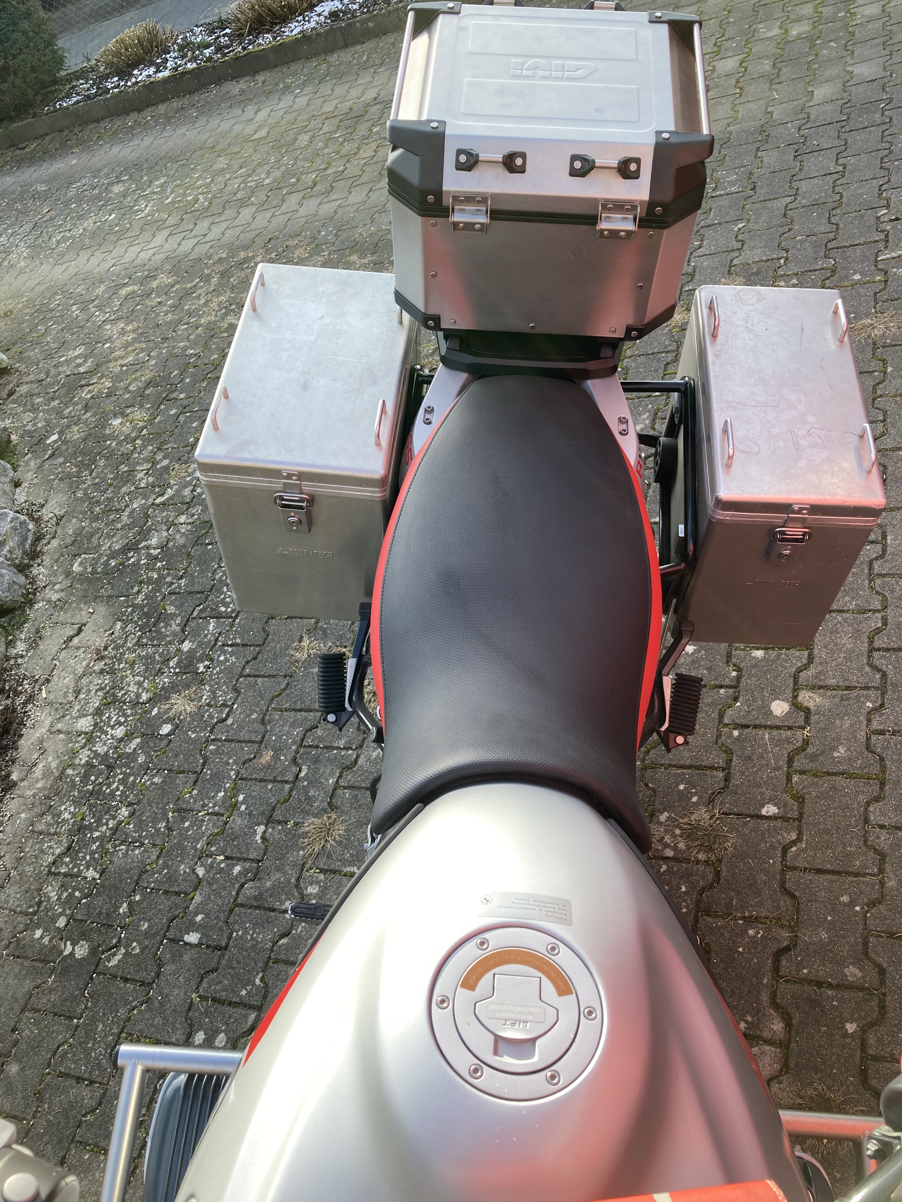 Die Sitzbank kam bereits im Winter aus der Sattlerei und wird uns nun mit Gelpads die Kilometerfresserei erleichtern. Das Alu-Topcase haben wir uns günstig im Sale besorgt – passt nun auch super zu den Koffern.