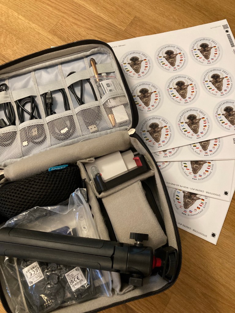 So langsam trudeln die Dinge ein, die wir noch so für unsere Tour benötigen. Sticker, Kabel, Stecker, Powerbank, Packsäcke und und und… 😄